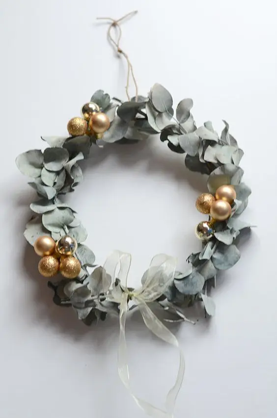 στεφάνι από ευκάλυπτο και χρυσά στολίδια