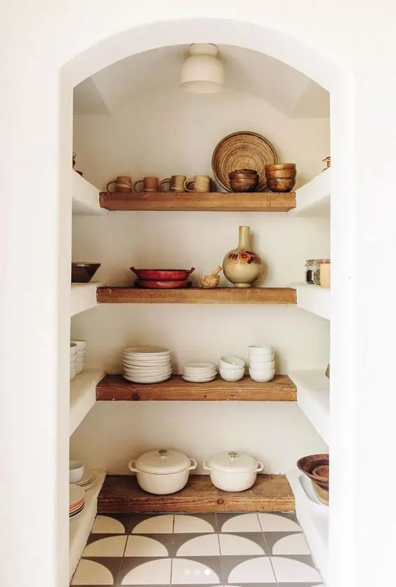 ένα όμορφο μεσογειακό δωμάτιο-ντουλάπα με τοξωτή είσοδο, ενσωματωμένα και λεκιασμένα ράφια και πολλά μαγειρικά σκεύη