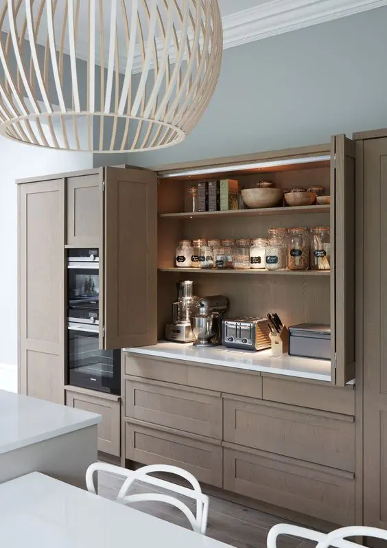 ένα μεγάλο γυαλιστερό κομψό ντουλάπι με συρόμενη πόρτα που κρύβει όλα τα είδη κουζίνας που μπορεί να χρειαστείτε