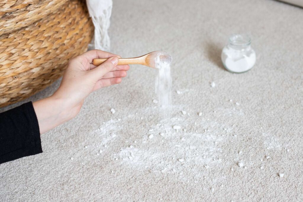 Για να εξαλείψετε τις οσμές, πασπαλίστε ένα παχύ στρώμα μαγειρικής σόδας πάνω από την πληγείσα περιοχή. Αφήστε το στο χαλί από 60 λεπτά έως 24 ώρες και, στη συνέχεια, σκουπίστε το με ηλεκτρική σκούπα. Όσο περισσότερο μένει η μαγειρική σόδα στο χαλί, τόσο περισσότερη μυρωδιά απορροφά. (Αλλά μην περπατάτε στο χαλί ενώ είναι καλυμμένο με μαγειρική σόδα!) Ακόμα κι αν αφήσετε τη μαγειρική σόδα να δράσει μόνο για 60 λεπτά, θα αφαιρέσει κάποιες μυρωδιές.