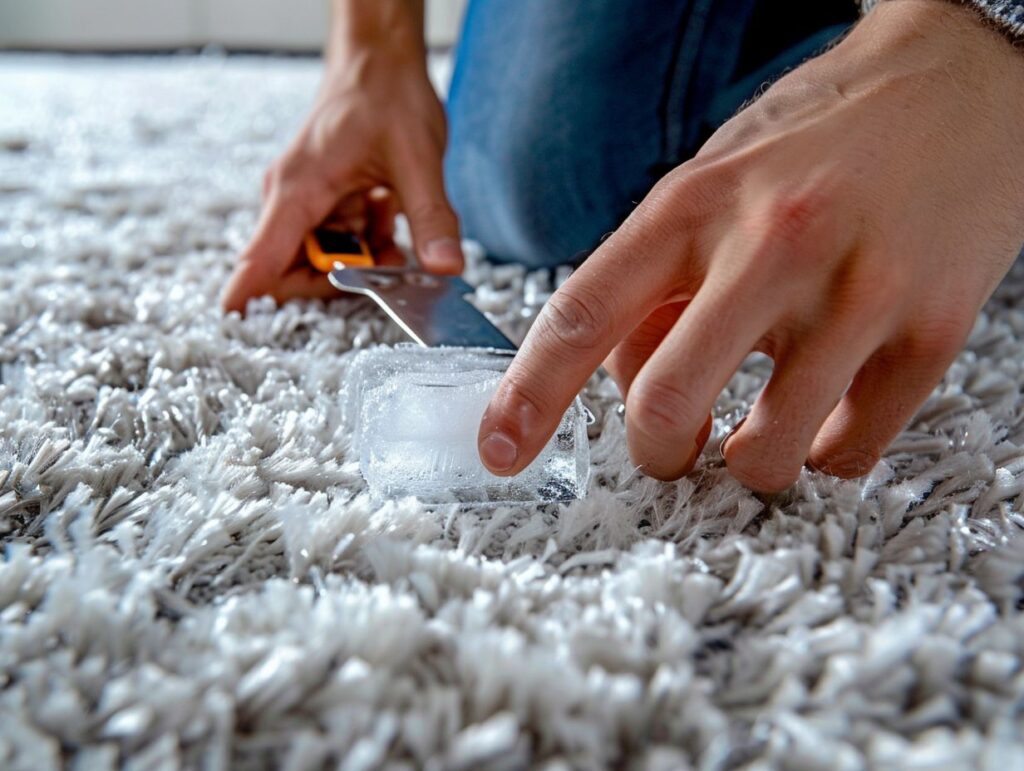 Πριν εφαρμόσετε πάγο, αφαιρέστε όσο περισσότερη τσίχλα μπορείτε με τα δάχτυλά σας. Στη συνέχεια, βάλτε δύο ή τρία παγάκια σε μια πλαστική σακούλα και βάλτε την πάνω από την τσίχλα. Μόλις σκληρύνει η τσίχλα, μπορείτε να το αφαιρέσετε πιο εύκολα από τις ίνες του χαλιού.