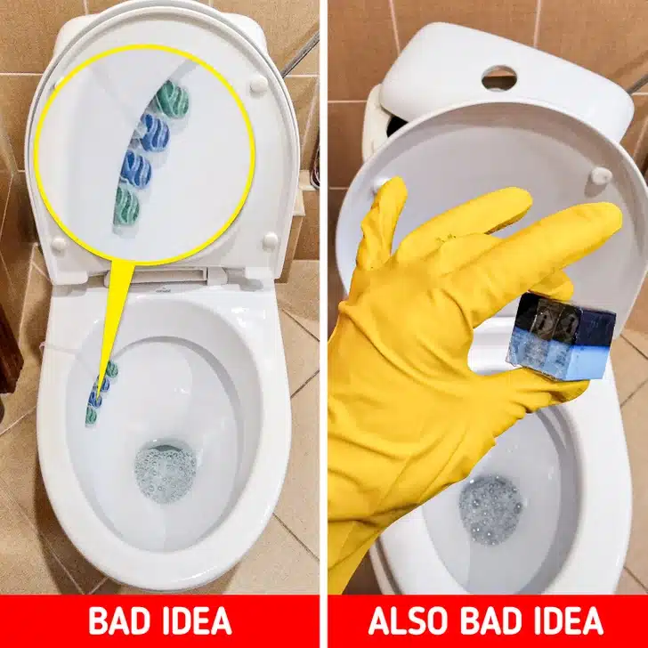 Τα μπλοκ απολύμανσης της τουαλέτας είναι στερεωμένα στην λεκάνη φαίνονται ακίνδυνα αλλά στην πραγματικότητα δεν είναι. Επειδή είναι συνήθως αρκετά ελαφριά, συχνά ξεπλένονται μαζί με το νερό. Κολλάνε στους σωλήνες και τους βουλώνουν. Επίσης πολλά από τα μπλοκ περιέχουν χλωρίνη που μπορεί να καταστρέψει τα ελαστικά μέρη στην τουαλέτα και να διαβρώσει τα μεταλλικά μέρη.