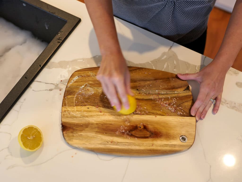 Μπορείτε να καθαρίσετε την ξύλινη σανίδα κοπής με μισό λεμόνι και λίγο χοντρό αλάτι. Το μόνο που έχετε να κάνετε είναι να κόψετε ένα λεμόνι στη μέση και να πασπαλίσετε το αλάτι πάνω από το ξύλο κοπής. Στη συνέχεια, με το λεμόνι στραμμένο προς τα κάτω, απλώς καθαρίστε την επιφάνεια της σανίδας κοπής, πιέζοντας ελαφρά για να απελευθερωθεί ο χυμός λεμονιού καθώς προχωράτε. Αφήστε το να καθίσει για περίπου 15 λεπτά για να δώσετε στο λεμόνι και το αλάτι λίγο χρόνο να δράσουν. Στη συνέχεια, ξύστε τυχόντα κομμάτια λεμονιού και ξεπλύνετε με ζεστό νερό και ένα καθαρό σφουγγάρι ή πανί.